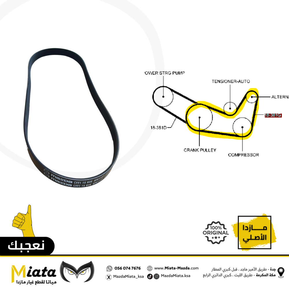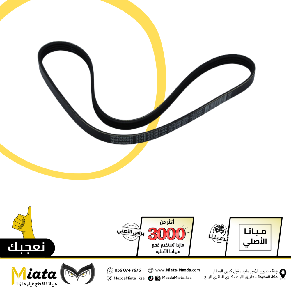 نبذة عن القطعة:سير المكينة (Engine Drive Belt) هو جزء أساسي في نظام نقل الحركة الخاص بمكينة سيارات مازدا. يعمل على نقل الحركة من عمود الكرنك إلى المكو...
