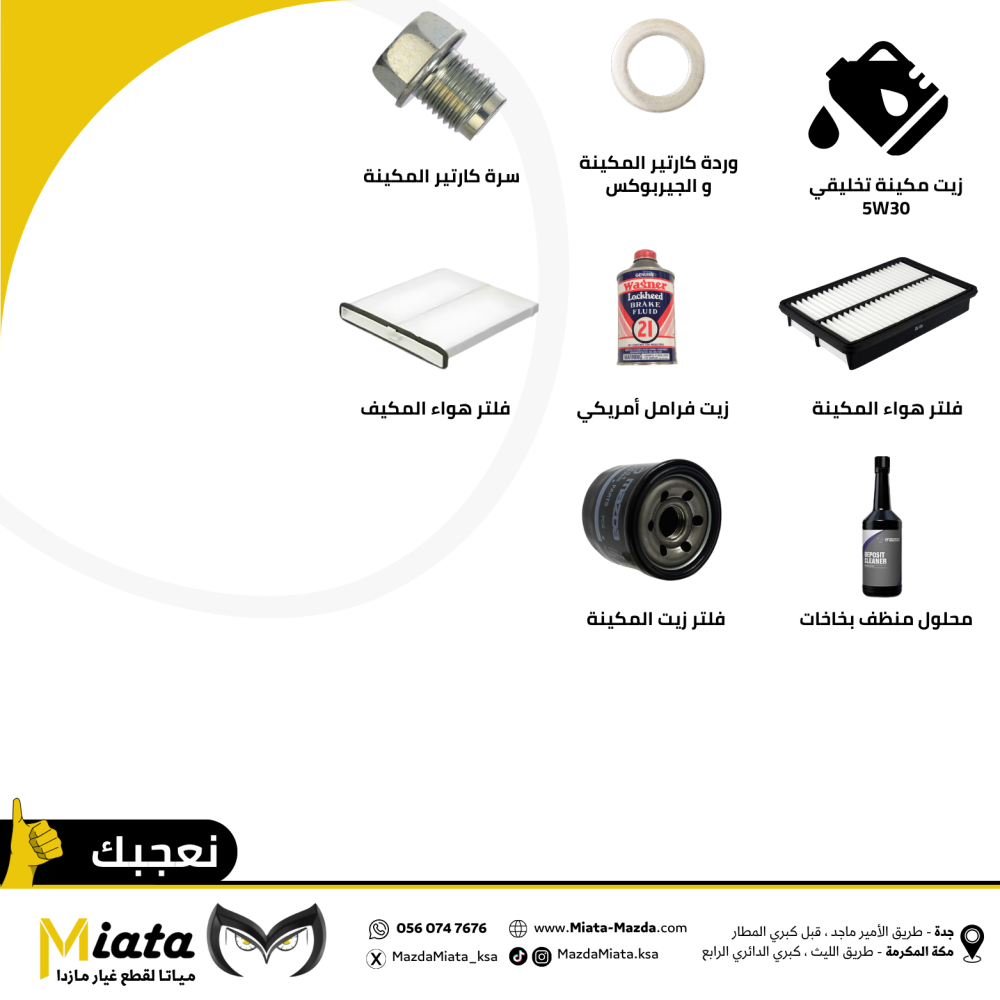 محتويات الباقة:عدد 1 فلتر زيت مكينة (أصلي مازدا )عدد 5 علب زيت مكينة موبيل تخليقي ( 5W30 ) 1 لترعدد 1 وردة كارتير المكينة (أصلي مازدا )عدد 1 سرة كارتي...