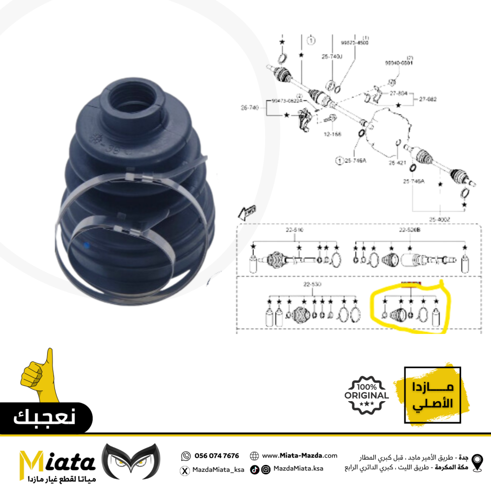 جلدة العكس (CV Boot) في سيارات مازدا هي قطعة مطاطية مرنة مصممة لحماية مفصل العكس (CV Joint) من الأتربة، الغبار، والرطوبة. كما تحافظ على الشحوم داخل المفصل لضمان حركته السلسة وطول عمره الافتراضي. توجد هذه الجلدة في نهايات عمود العكس (Axle Shaft).