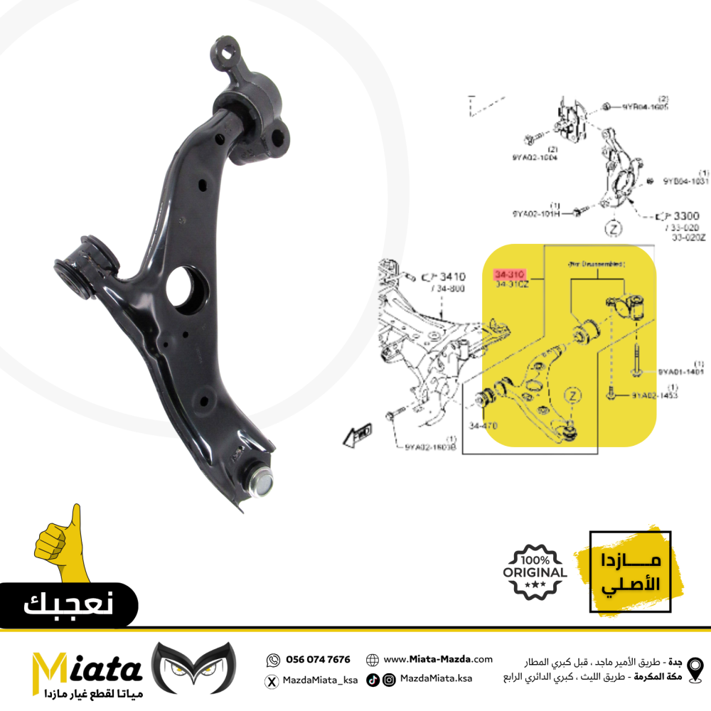 المقص الأمامي (Front Lower Control Arm) هو جزء أساسي في نظام التعليق الخاص بسيارات مازدا. يعمل على الربط بين هيكل السيارة والعجلة الأمامية، مما يسمح بحركة سلسة للعجلة وامتصاص الصدمات. يحتوي على جلود (Bushings) وجوزة (Ball Joint) لتوفير ثبات ودعم إضافي.