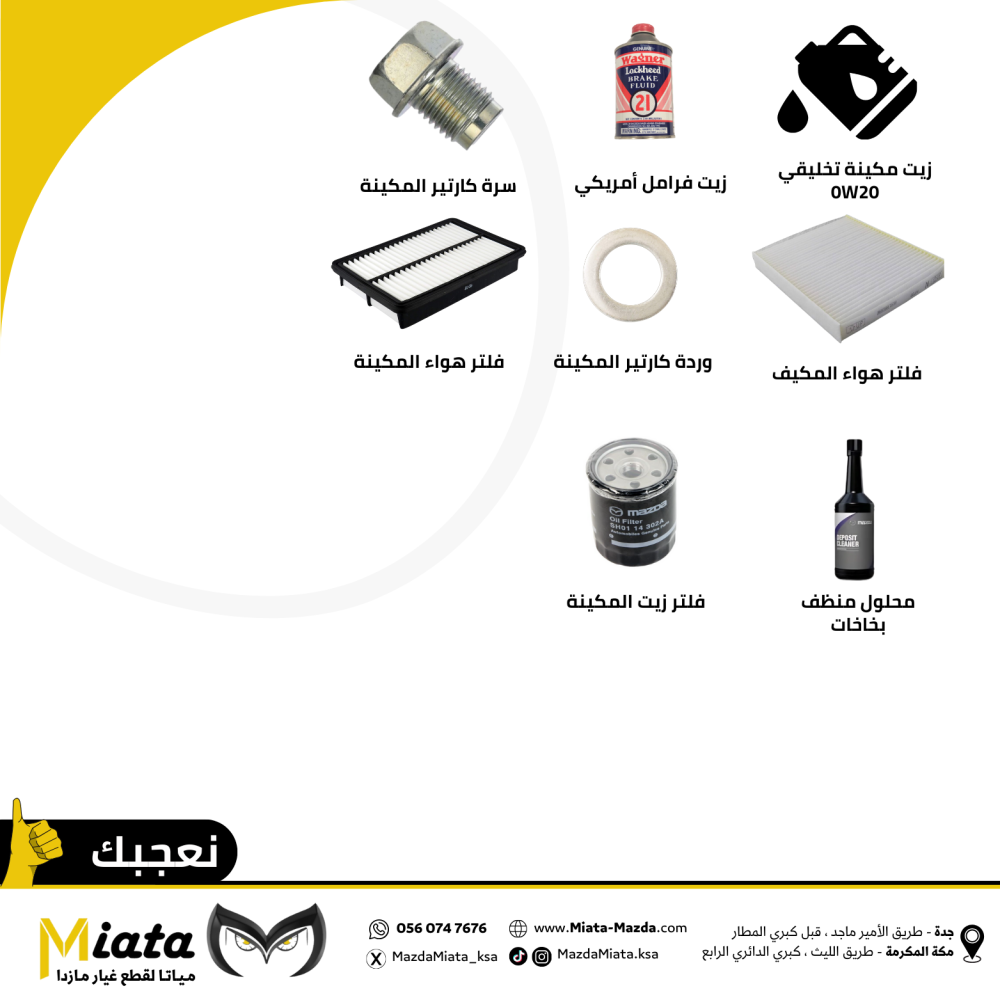 محتويات الباقة:عدد 1 فلتر زيت مكينة (أصلي مازدا )عدد 6 علب زيت مكينة موبيل تخليقي ( 0W20 ) 1 لترعدد 1 وردة كارتير المكينة (أصلي مازدا )عدد 1 سرة كارتي...