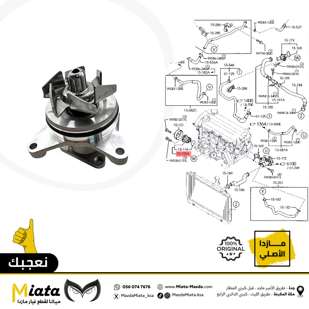 نبذة عن القطعة:طرمبة ماء الرديتر (Water Pump) هي جزء أساسي في نظام التبريد الخاص بمكينة سيارات مازدا. تعمل على تدوير سائل التبريد لضمان الحفاظ على درج...