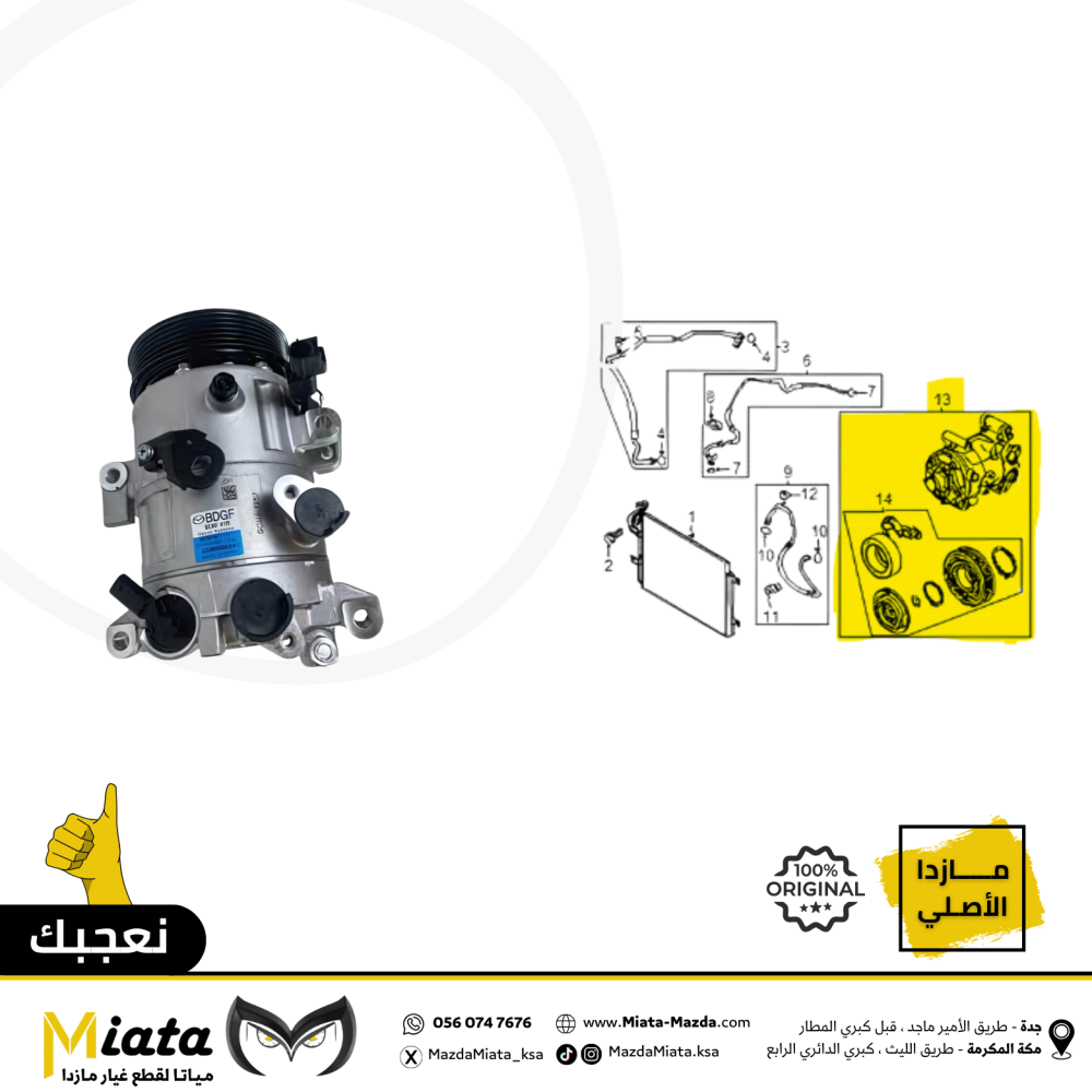 نبذة عن القطعة:كمبروسر مكيف (Air Conditioning Compressor) هو جزء من نظام التكييف في مازدا. يُستخدم لضغط ونقل غاز التبريد عبر النظام لتوفير الهواء البا...