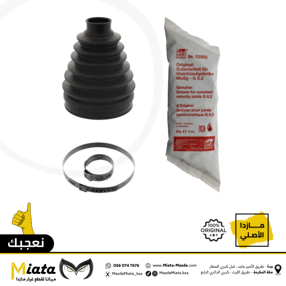 The CV Boot in Mazda vehicles is a flexible rubber piece designed to protect the CV Joint from dirt, dust, and moisture. It also keeps grease inside the joint to ensure smooth movement and long life. This boot is located at the ends of the CV Joint Axle Shaft.