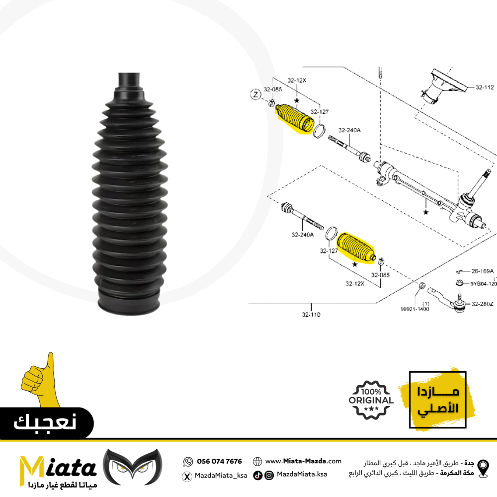 The Steering Rack Boot on Mazda vehicles is a rubber cover designed to protect the steering rack from dust, dirt, and moisture. This piece is located on both ends of the steering column and acts as a protective barrier to prevent grease or other elements from entering the steering system.